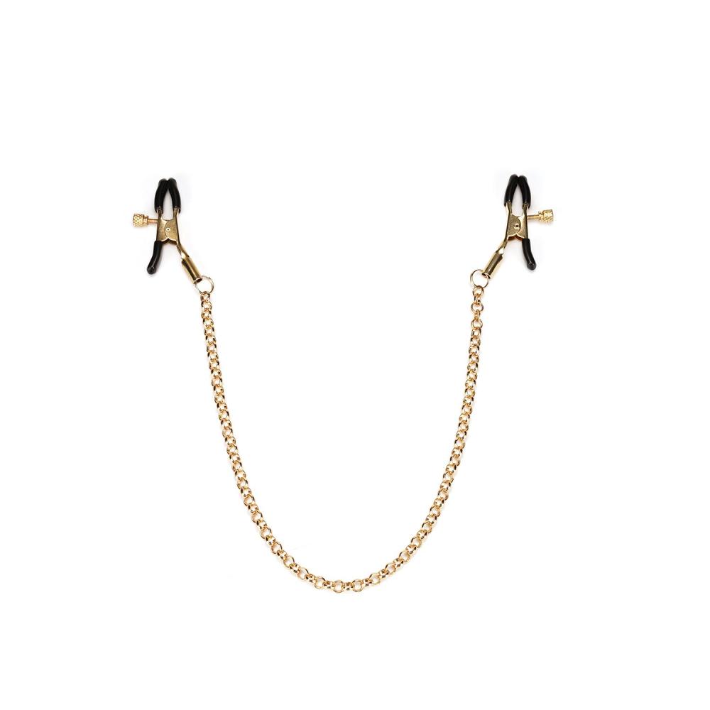 - Зажимы на цепочке для сосков. Зажимы завинчиваются, чтобы отрегулировать силу сжатия. Силиконовые накладки позволяют не повредить сосок даже при очень сильном воздействии! Цепочка не просто шикарно выглядит, но и дает возможность дополнительно поиграть с ощущениями: легко потяните за цепочку, чтобы впечатления от зажимов стали более яркими. Общая длина (зажимы + цепочка): 48 см.