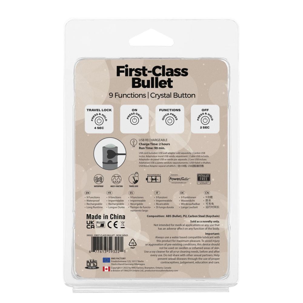 Лаконичная роскошь классической конической формы с красивой матовой металлической текстурой и мерцающим кристаллом в основании — все это новая вибропуля First-Class Bullet от бренда PowerBullet. Порадует вас и 100 % водозащита, благодаря которой вы можете смело играть с пулей в ванной, джакузи или бассейне.
